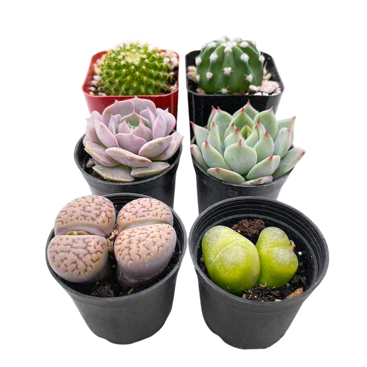2 Cactus + 2 Lithops + 2 Echeveria Succulents (2", Random Varieties)