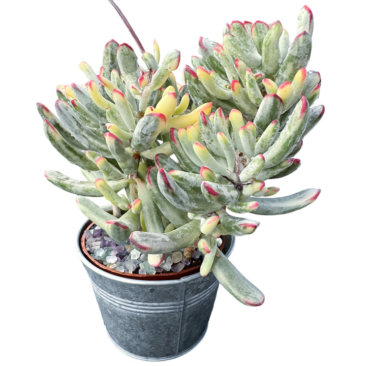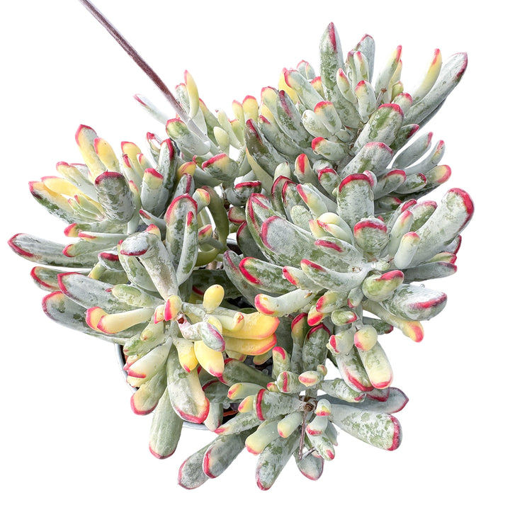 Cotyledon Orbiculata cv.long Leaf Variegated has narrow, stick-shaped leaves. The leaf color of the overall plant is gray-green with farina on the surface. Cotyledon Orbiculata cv.long Leaf Variegated's leaf tips and margins are dark red or maroon. The reddish-brown lines on the leaf margins are more pronounced when the plant is colored.