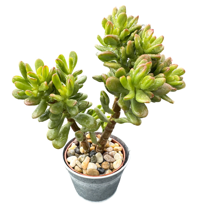 The perennial succulent Crassula Ovata 'Gollum' grows in the Mediterranean climate. It is a shrubby plant with conspicuous, rounded stems and a yellowish-brown or grayish-brown epidermis. It has alternate leaves, growing in dense clusters at the tips of the stems or branches, fleshy leaf cylinders, 4cm to 5cm long, obliquely truncated at the tips, usually elliptical in cross-section, and bright green in color with a yellowish tinge at the ends. Its leaves are somewhat peculiar and pleasantly colored when they bloom in winter.