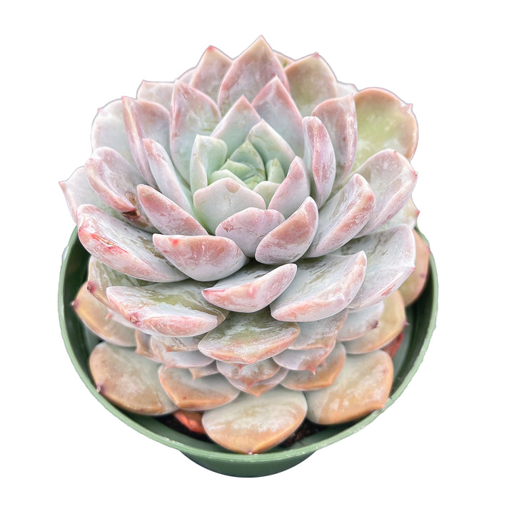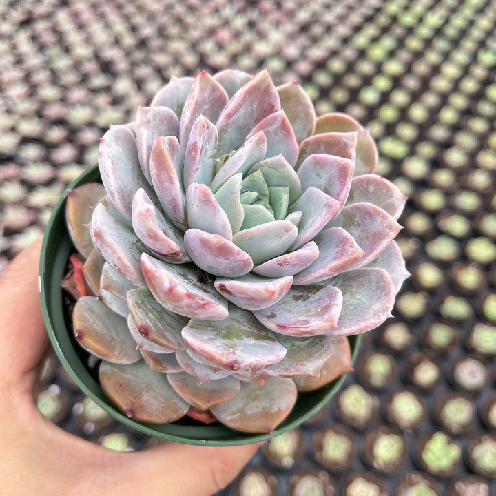 Echeveria 'Amazing Grace' is a premier hybrid cultivar distinguished by its elegant rosettes and dynamic color transformation. This specimen develops 5-6 inch symmetrical spirals of spatulate leaves with a base hue of dusty seafoam green. Under sustained sunlight exposure, the foliage transitions to a gradient of blush-pink margins and lavender undertones, accentuated by delicate red edging. Mature plants produce arching inflorescences in late spring, bearing bell-shaped flowers with tangerine petals and golden throats. Its exceptional stress coloration and prolific offsetting habit make it ideal for ornamental containers and living wall installations.