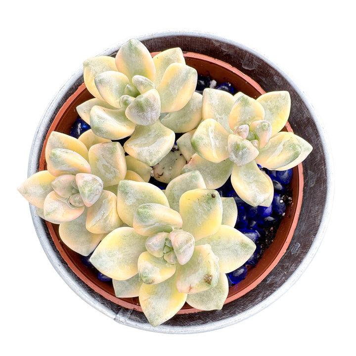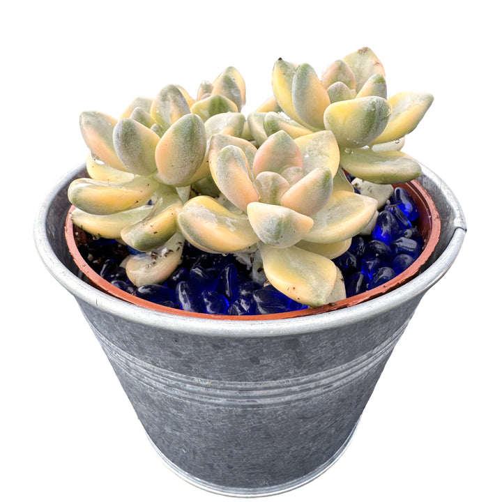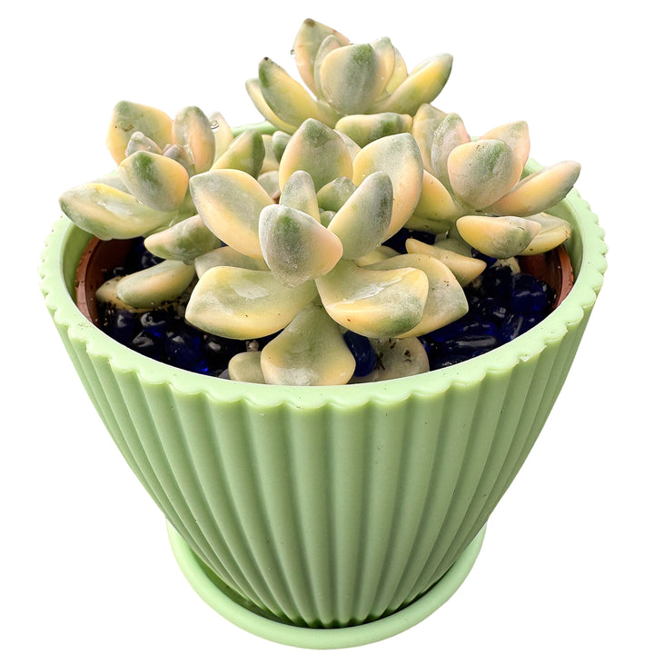 Pachyphytum 'Apricot Beauty' is a beautiful variegated succulent with leaves ranging from pale yellow to light pink, interspersed with green in the middle. The triangular leaves have a raised back, giving them a plump and adorable appearance. While the plant typically has a small stature, it readily produces numerous offsets. Over time, the stems elongate, and leaves may drop, creating a cascading or cliffhanging succulent.