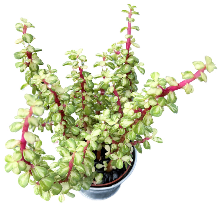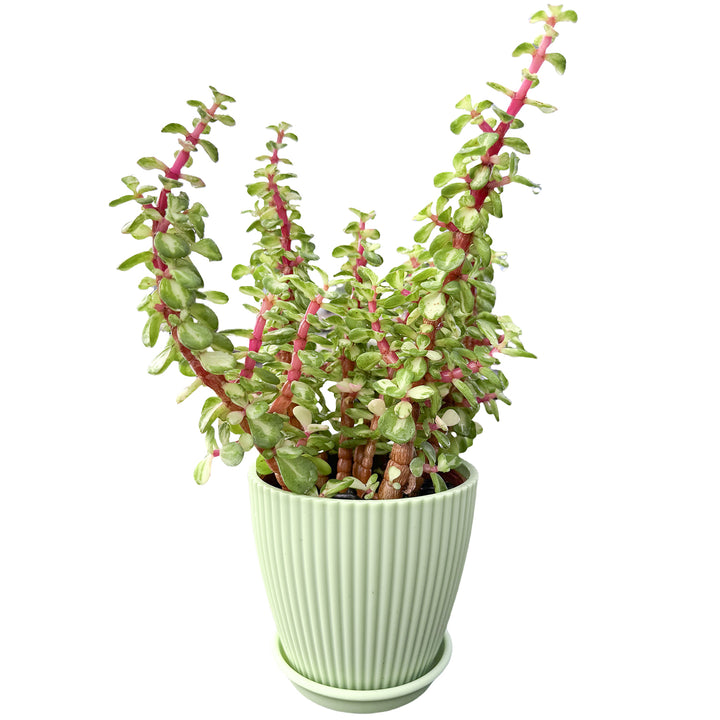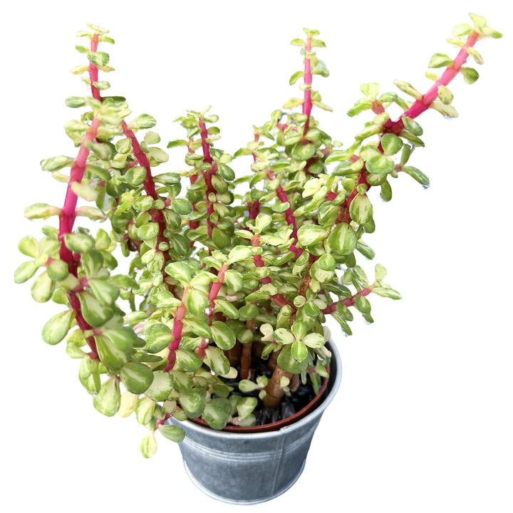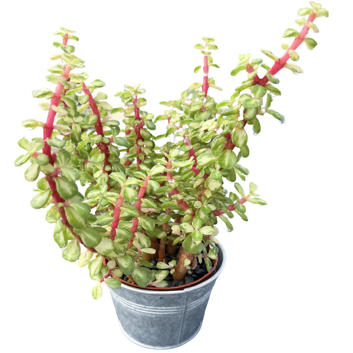 Wow, the Portulacaria Afra 'Variegata,' also known as Rainbow Bush, is a stunning succulent with many branches that create a lush look. Its pink stems and smooth, fleshy green leaves with cream-colored rounded edges give it a unique appearance. And let's remember its lavender star-shaped flowers that bloom in late spring and early summer! The plant's dense, rounded leaves have a lovely color and texture that will brighten any space.