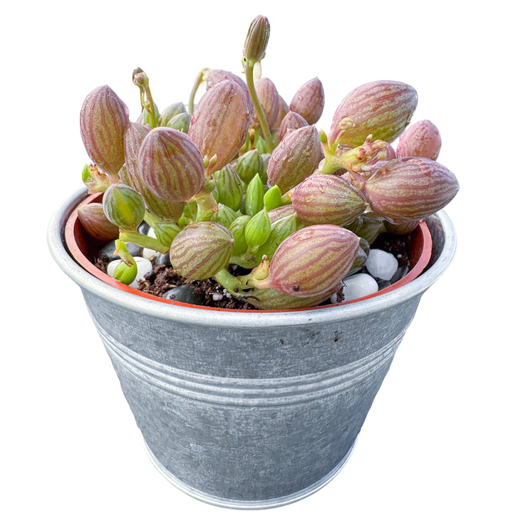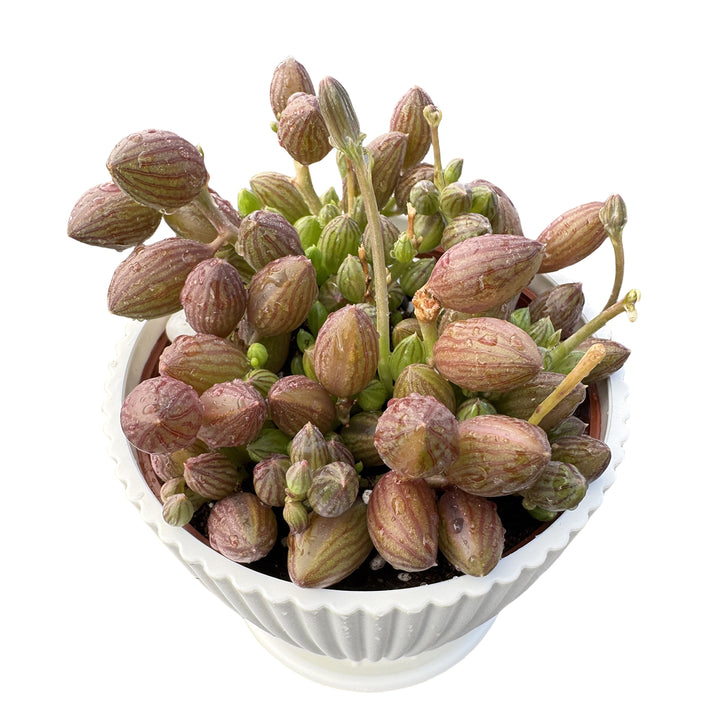 String of Watermelons is a fascinating succulent that resembles String of Pearls, with round leaves trailing on slender stems from the pot or along the ground. What makes it interesting are the deep green or purple-striped leaves, resembling miniature watermelons. These stripes, known as "Leaf window," are adaptations to protect against intense sunlight in their native habitat; exposure to bright sunlight enhances their color.